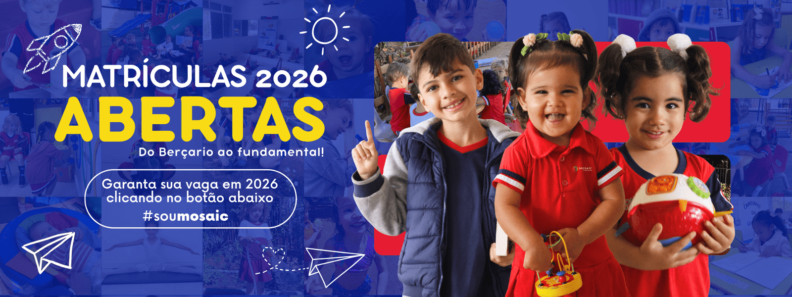 O Colégio Mosaic By Encantado já está com as matrículas abertas para o ano letivo de 2026! Garanta a vaga do seu filho em uma escola acolhedora, que estimula o aprendizado com propósito e desenvolve o potencial de cada aluno.
